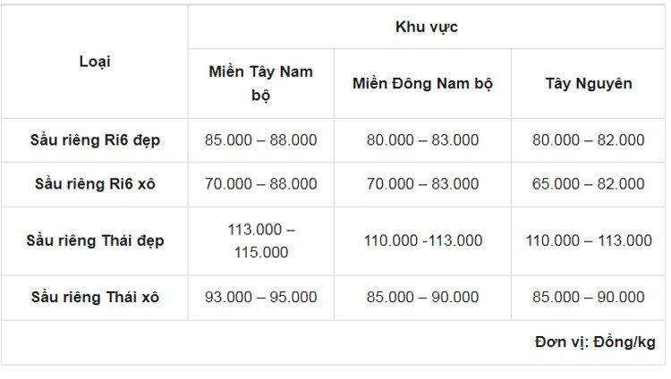 Tại khu vực miền Tây Nam Bộ: Chủng sầu riêng Ri6 đẹp đạt 85.000 - 88.000 và sầu riêng Ri6 xô đạt 70.000 – 88.000 đồng/kg; sầu riêng Thái đẹp ở mức 113.000 – 115.000 đồng/kg; sầu riêng Thái xô ở mức 93.000 – 95.000 đồng/kg.
