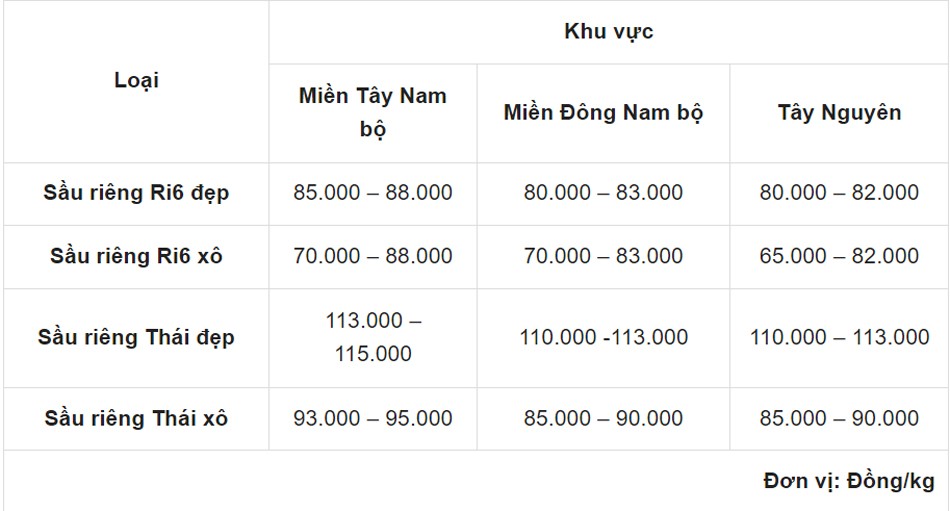 Tại khu vực miền Tây Nam bộ: Chủng sầu riêng Ri6 đẹp đạt 85.000 - 88.000 và sầu riêng Ri6 xô đạt 70.000 – 88.000 đồng/kg; sầu riêng Thái đẹp ở mức 113.000 – 115.000 đồng/kg; sầu riêng Thái xô ở mức 93.000 – 95.000 đồng/kg.