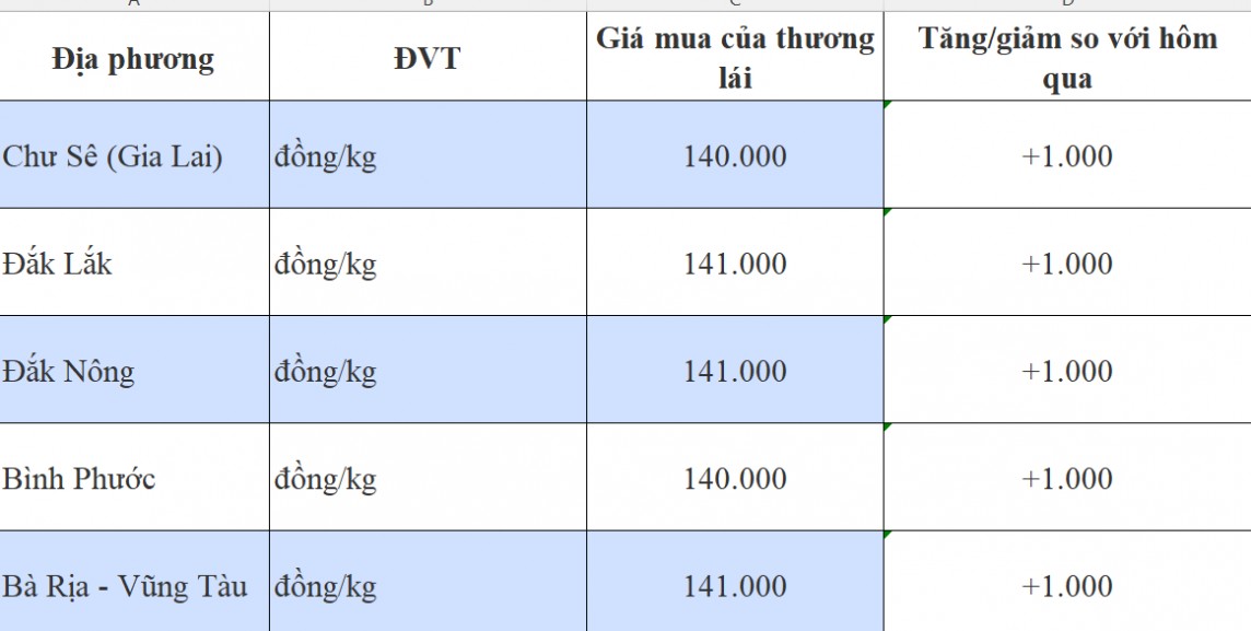 Theo đó,giá tiêu Đắk Lắk được thu mua ở mức 141.000 đồng/kg đi ngang so với ngày hôm qua. Giá tiêu Chư Sê (Gia Lai) thu mua ở mức 140.000 đồng/kg tăng 1.000 đồng so với ngày hôm qua. Giá tiêu Đắk Nông hôm nay ghi nhận ở mức 141.000 đồng/kg tăng 1.000 đồng/kg so với ngày hôm qua.