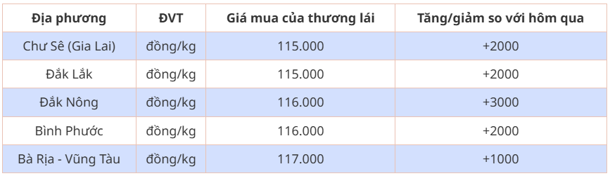Tại khu vực Đông Nam Bộ giá tiêu hôm nay tiếp đà tăng mạnh. Theo đó, tại khu vực Bà Rịa – Vũng Tàu tăng thêm 1.000 đồng/kg, lên mức đỉnh 117.000 đồng/kg và khu vực Bình Phước lên mức 116.000 đồng/kg, tăng 2.000 đồng/kg so với hôm qua.