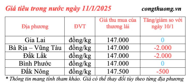 | Giá tiêu trong nước cập nhật ngày 11/1/2025 |