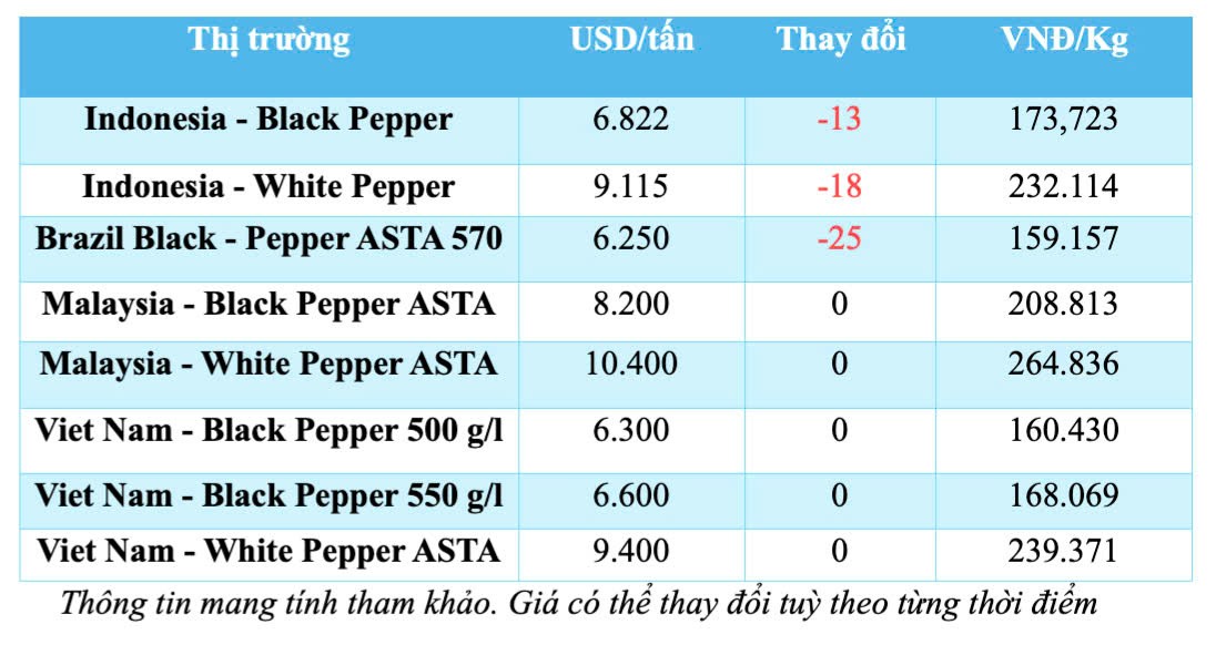 Cụ thể, IPC niêm yết giá tiêu đen Lampung của Indonesia đạt 6.822 USD/tấn (giảm 13 USD/tấn); tương tự giá tiêu trắng Muntok ở mức 9.115 USD/tấn (giảm 18 USD/tấn) so với phiên giao dịch trước.