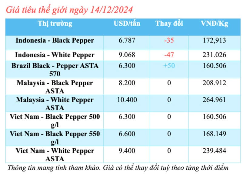 | Cập nhật giá tiêu thế giới hôm nay ngày 14/12/2024 |