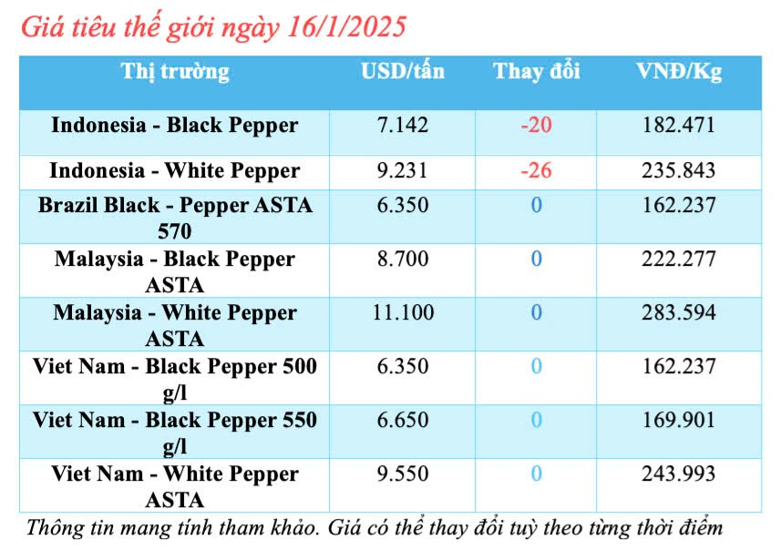 | Cập nhật giá tiêu thế giới hôm nay ngày 16/1/2025 |