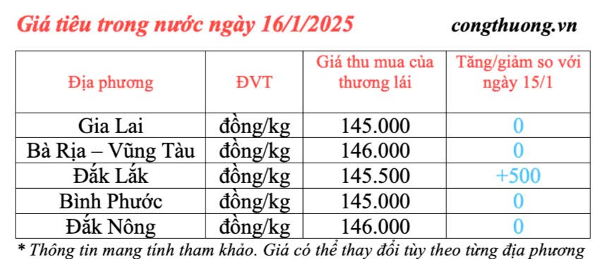 | Giá tiêu trong nước cập nhật ngày 16/1/2025 |