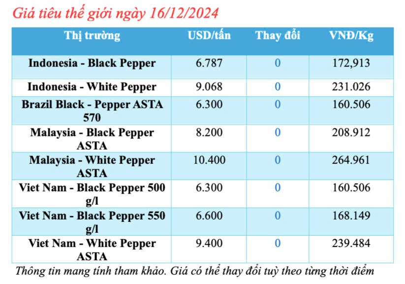 Cập nhật giá tiêu thế giới hôm nay ngày 16/12/2024