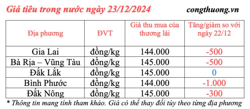 | Giá tiêu trong nước cập nhật ngày 23/12/2024 |