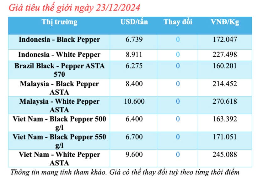 | Cập nhật giá tiêu thế giới hôm nay ngày 23/12/2024 |