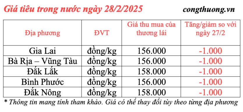 Giá tiêu hôm nay được cập nhật chiều ngày 28/2/2025 như sau, giá tiêu trong nước giảm nhẹ so với phiên giao dịch trước, mức giảm 1.000 đồng/kg ở tất cả các địa phương. Hiện giá tiêu thu mua trung bình tại các địa bàn trọng điểm là 156.800 đồng/kg.