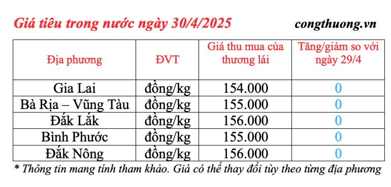 | Giá tiêu trong nước cập nhật chiều ngày 30/4/2025 |