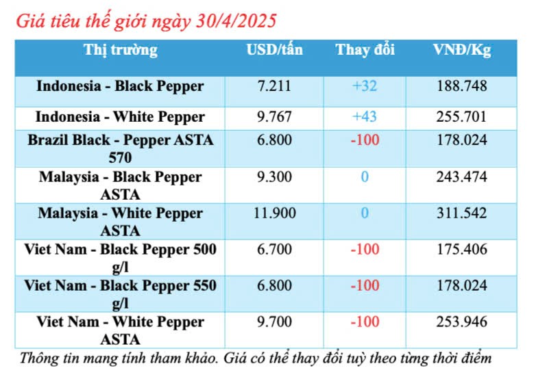 | Cập nhật giá tiêu thế giới chiều ngày 30/4/2025 |
