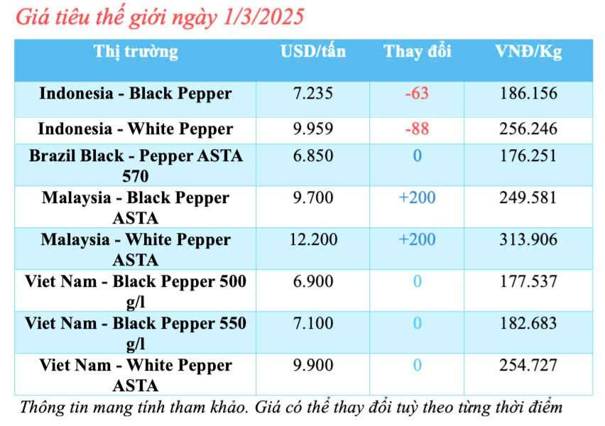 | Cập nhật giá tiêu thế giới hôm nay ngày 1/3/2025 |