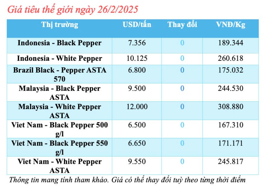 | Cập nhật giá tiêu thế giới hôm nay ngày 26/2/2025 |