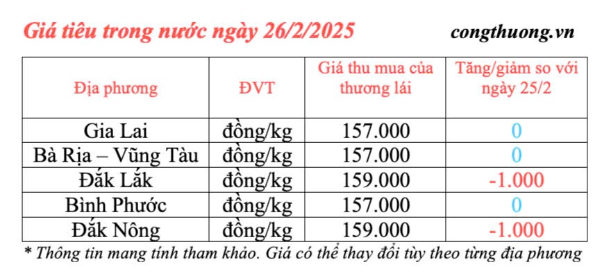 Giá tiêu hôm nay được cập nhật chiều ngày 26/2/2025 như sau, giá tiêu trong nước tiếp tục giảm nhẹ, mức giảm từ 1.000 đồng/kg, giá tiêu đã xuống dưới mốc 160.000 đồng/kg ở tất cả các địa phương. Hiện giá tiêu thu mua trung bình tại các địa bàn trọng điểm là 157.800 đồng/kg.