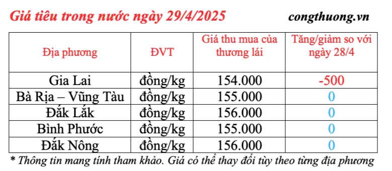 | Giá tiêu trong nước cập nhật chiều ngày 29/4/2025 |