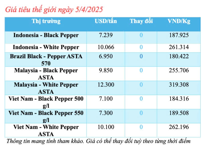 | Cập nhật giá tiêu thế giới chiều ngày 5/4/2025 |