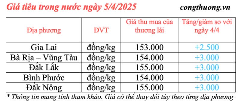 Giá tiêu hôm nay được cập nhật chiều ngày 5/4/2025 như sau, thị trường tiêu trong nước đảo chiều tăng cao trở lại so với hôm qua, mức tăng từ 2.500 - 3.000 đồng/kg. Hiện giá tiêu thu mua trung bình tại các địa bàn trọng điểm là 154.200 đồng/kg.