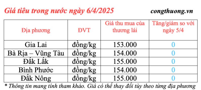 | Giá tiêu trong nước cập nhật chiều ngày 6/4/2025 |