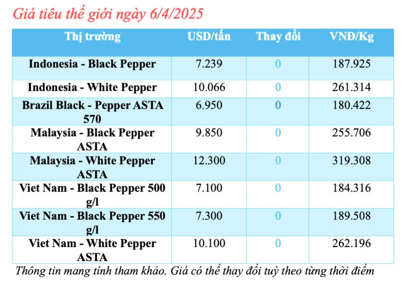 | Cập nhật giá tiêu thế giới chiều ngày 6/4/2025 |