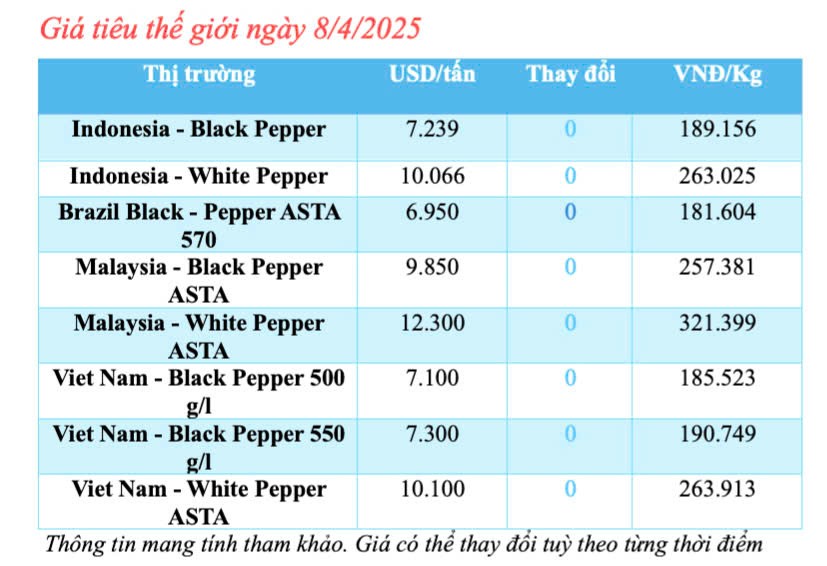 | Cập nhật giá tiêu thế giới chiều ngày 8/4/2025 |