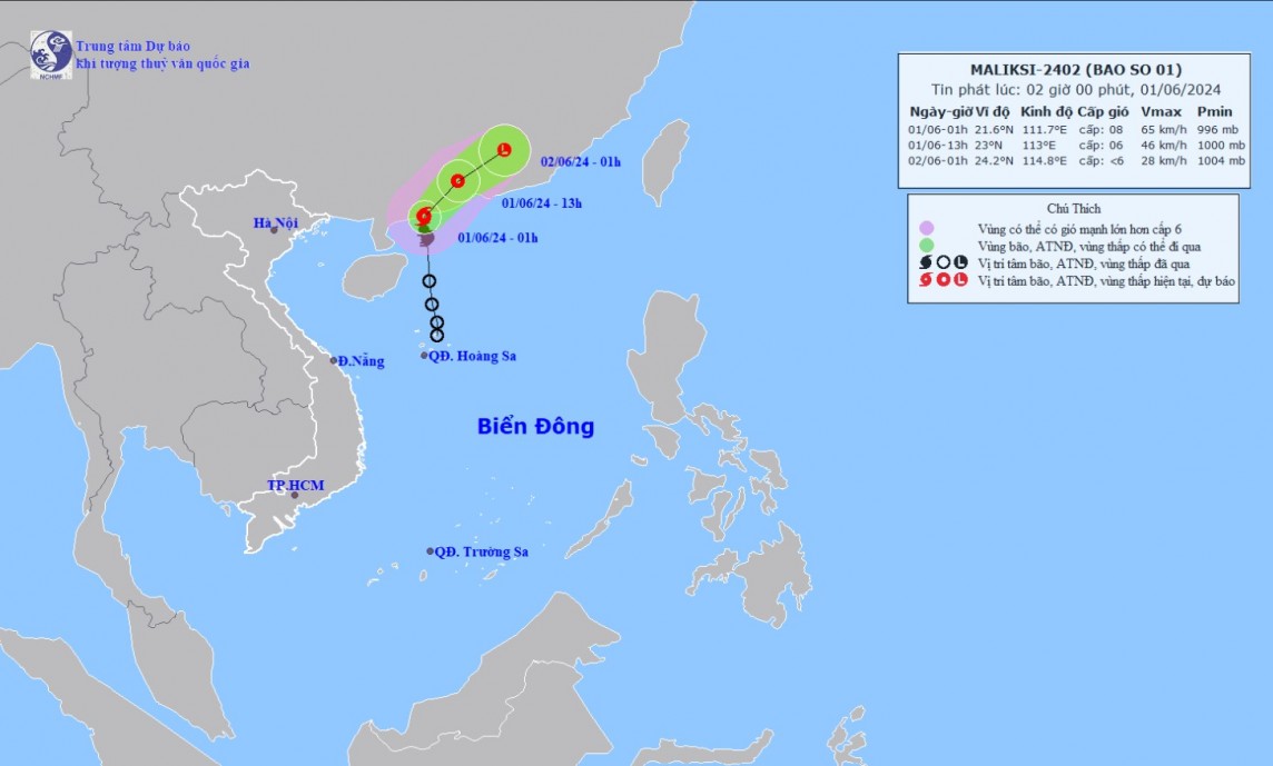 Theo Trung tâm Dự báo khí tượng thủy văn quốc gia, dự báo thời tiết sáng sớm nay (01/6), sau khi đi vào đất liền khu vực phía Nam tỉnh Quảng Đông (Trung Quốc) bão số 1 đã suy yếu thành áp thấp nhiệt đới.