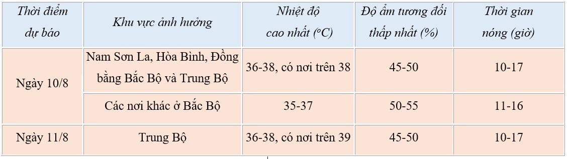 Ngày 10-11/8, khu vực từ Trung Bộ có nắng nóng và nắng nóng gay gắt, có nơi đặc biệt gay gắt với nhiệt độ cao nhất phổ biến từ 36-38 độ, có nơi trên 39 độ; độ ẩm tương đối thấp nhất phổ biến 45-50%.