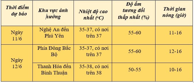 Ngày 12/6 khu vực phía Đông Bắc Bộ và khu vực từ Thanh Hóa đến Bình Thuận có nắng nóng, có nơi nắng nóng gay gắt với nhiệt độ cao nhất phổ biến từ 35-38 độ, có nơi trên 38 độ; độ ẩm tương đối thấp nhất phổ biến 50-60%.