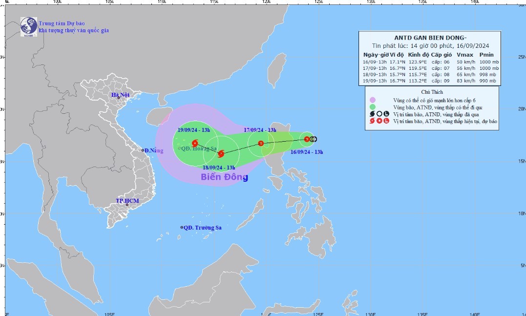 Theo Trung tâm Dự báo khí tượng thủy văn quốc gia: Hồi 13 giờ ngày 16/9, vị trí tâm áp thấp nhiệt đới ở vào khoảng 17,1 độ Vĩ Bắc; 123,9 độ Kinh Đông, trên vùng biển phía Đông đảo Lu Dông (Philippin). Sức gió mạnh nhất vùng gần tâm áp thấp nhiệt đới mạnh cấp 6-7 (39-61km/h), giật cấp 9; di chuyển chủ yếu theo hướng Tây khoảng 15km/h. Dự báo diễn biến áp thấp nhiệt đới (trong 24 đến 48 giờ tới): Hồi13h ngày 17/9, vị trí tâm áp thấp nhiệt đới ở vào khoảng 16,7 N-119,5E; trên vùng biển phía Đông của khu vực Bắc Biển Đông. Sức gió mạnh nhất vùng gần tâm áp thấp nhiệt đới mạnh cấp 7, giật cấp 9, di chuyển theo hướng Tây, 15-20km/h, di chuyển vào Biển Đông. Hồi 13h ngày 18/9, vị trí tâm áp thấp nhiệt đới ở vào khoảng 15,7N-115,7E; cách quần đảo Hoàng Sa khoảng 350km về phía Đông Đông Nam. Sức gió mạnh nhất vùng gần tâm áp thấp nhiệt đới mạnh cấp 8, giật cấp 10, di chuyển theo hướng Tây Tây Nam khoảng 20km/h, có thể mạnh lên thành bão. |