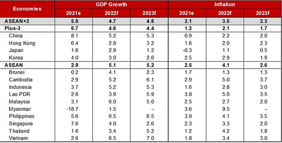 Theo Báo cáo hàng năm "Triển vọng kinh tế khu vực ASEAN + 3 năm 2022" công bố ngày 12/4/2022, Văn phòng Nghiên cứu kinh tế vĩ mô ASEAN + 3 (AMRO) dự báo: Năm 2022, Việt Nam sẽ đạt mức tăng trưởng 6,5% GDP và lạm phát 3,4% (còn năm 2023 các con số sẽ tương ứng là 7% và 3%). Tăng trưởng GDP của ASEAN + 3 (gồm các nước ASEAN, Trung Quốc, Nhật Bản, Hàn Quốc) năm 2022 đạt 4,7% và đạt mức 4,6% vào năm 2023. Trong đó, mức tăng trưởng của ASEAN năm 2022 là 5,1% và 5,2% vào năm 2023.