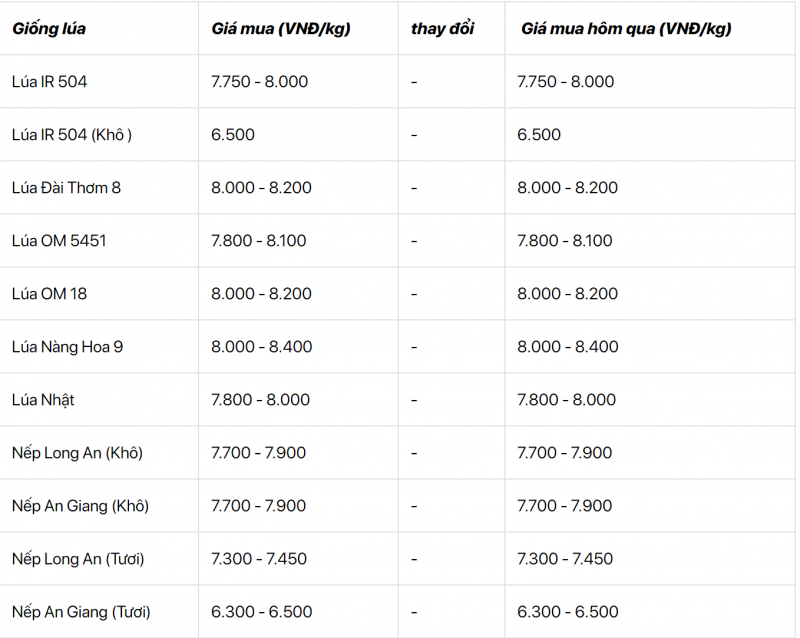 Về giá lúa, theo cập nhật của Sở Nông nghiệp và Phát triển nông thôn tỉnh An Giang, lúa OM 5451 có mức giá 7.800 - 8.100 đồng/kg; lúa Đài thơm 8 ổn định ở mức 8.000 - 8.200 đồng/kg; lúa OM 18 được dao động quanh mốc 8.000 - 8.200 đồng/kg; nàng Hoa 9 giá 8.000 - 8.400 đồng/kg; lúa IR 50404 ổn định ở mức 7.800 - 8.000 đồng/kg; lúa Nhật 7.800 - 8.000 đồng/kg.