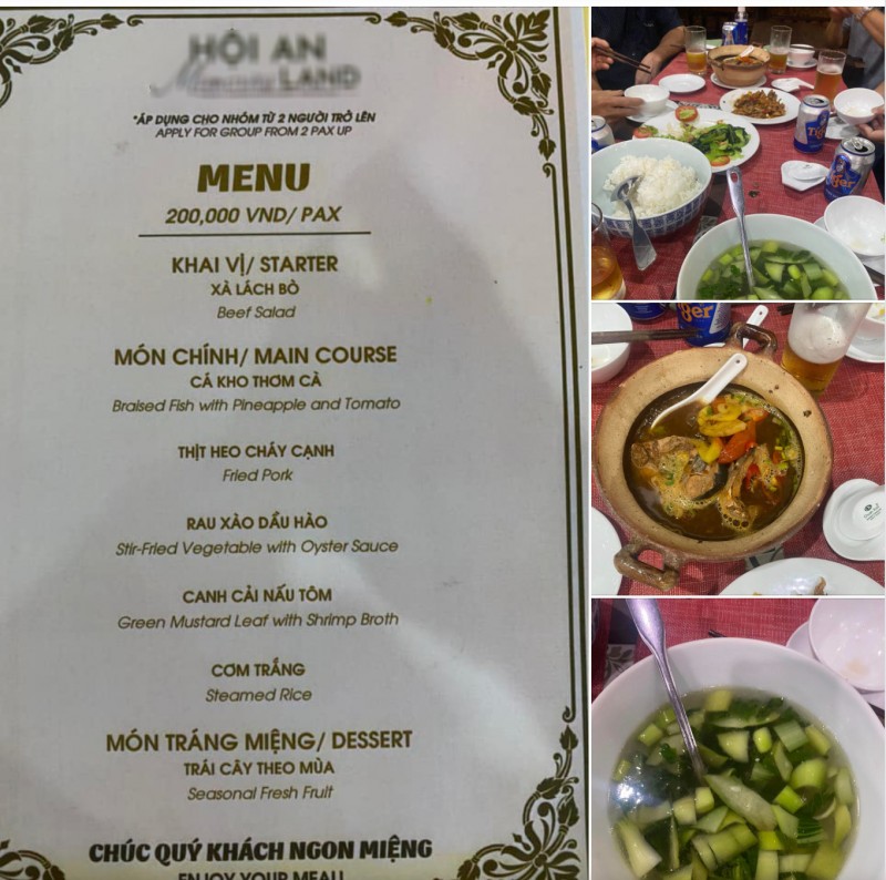 Cụ thể, trên một group Facebook có hơn 1,1 triệu thành viên, một tài khoản viết "Toàn cảnh bữa cơm 200.000 đồng/người tại Hội An. Bữa cơm kèm vé đi xem Show Ký ức Hội An, bữa cơm được tính riêng 200.000 đồng/người. Trong hình có bia 60.000 đồng/lon tính riêng. Đoàn mình 19 người ngơ ngác. Ngày đầu đến Hội An được tiếp thịt heo cháy cạnh, cá kho và rau cải xào + nấu canh".