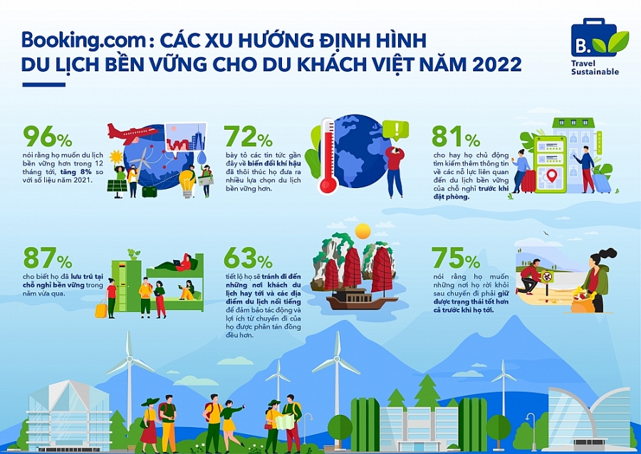 Theo báo cáo “Du lịch bền vững năm 2022” vừa được công bố bởi Booking.com, 96% du khách Việt nói rằng họ muốn du lịch bền vững hơn trong 12 tháng tới, tăng 8% so với số liệu năm 2021 của Booking.com. Báo cáo này khảo sát khoảng 32.000 du khách từ 32 quốc gia, trong đó có trên 1.000 du khách người Việt Nam.