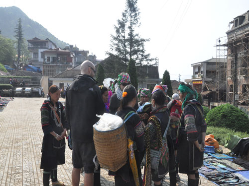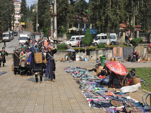 Không chỉ xuất hiện ở mọi con đường quanh thị trấn, ngay tại sân vận động giữa thị trấn, tất cả các ngày trong tuần, du khách đều có thể bắt gặp những bà già, phụ nữ, các cô gái và cả trẻ em, trải những tấm bạt bày bán hàng thổ cẩm. Vừa bán hàng, những người phụ nữ này vừa thêu thùa khá chăm chú. Tuy nhiên, tìm hiểu ra mới biết, đa phần mũ, áo, khăn, váy… bày bán đều là những sản phẩm được mua từ Trung Quốc, những phụ nữ này chỉ khâu, đính, thêu thêm 1 vài chi tiết nhỏ để “hô biến” thành sản phẩm của Sa Pa.