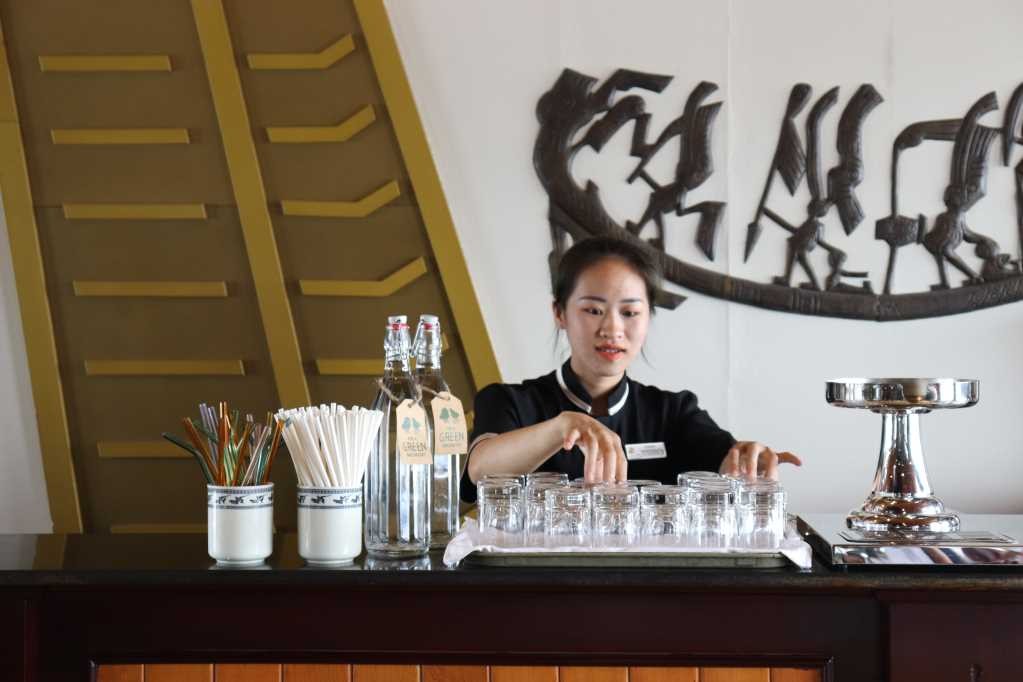 Tàu nghỉ đêm trên Vịnh Hạ Long sử dụng cốc thủy tinh, ống hút giấy để giảm thiểu rác thải nhựa, bảo vệ môi trường. Ảnh: Bình Nguyên |