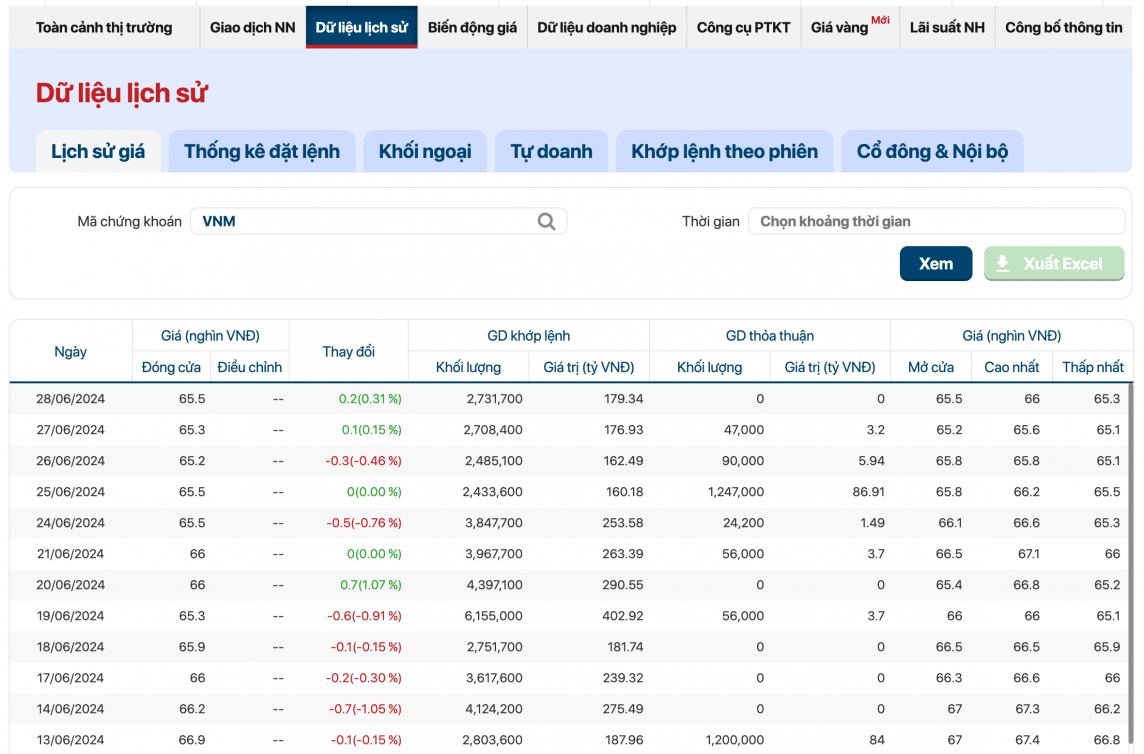 | Cổ phiếu VNM có xu hướng đi xuống trong thời gian vừa qua. (Ảnh: Chụp màn hình thống kê tại website của cafef.) |