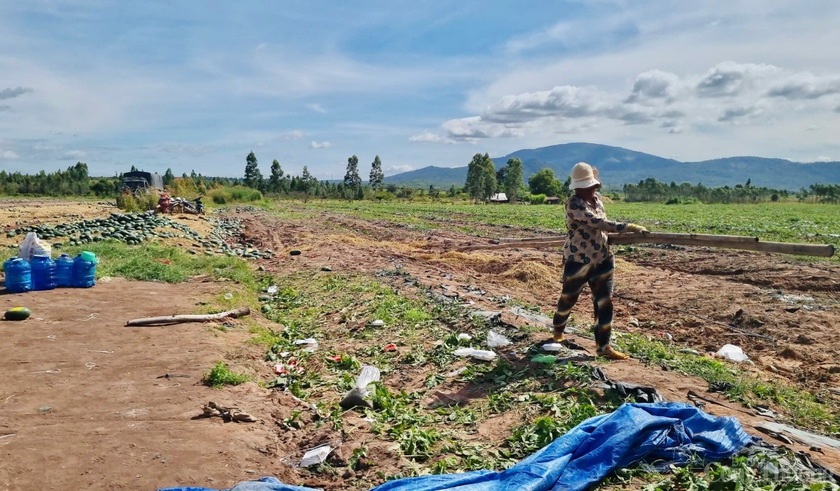 | Nhiều rẫy dưa chất lượng kém thương lái không thu mua, người dân vứt lăn lóc ngoài đồng |