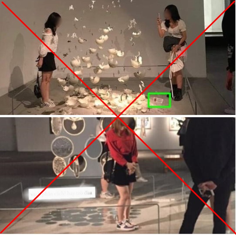 | Một số bạn trẻ vô tư dẫm lên tác phẩm vào khu vực có biển cấm tác động lên tác phẩm trong một triển lãm ở Hà Nội. (Ảnh chụp màn hình). |