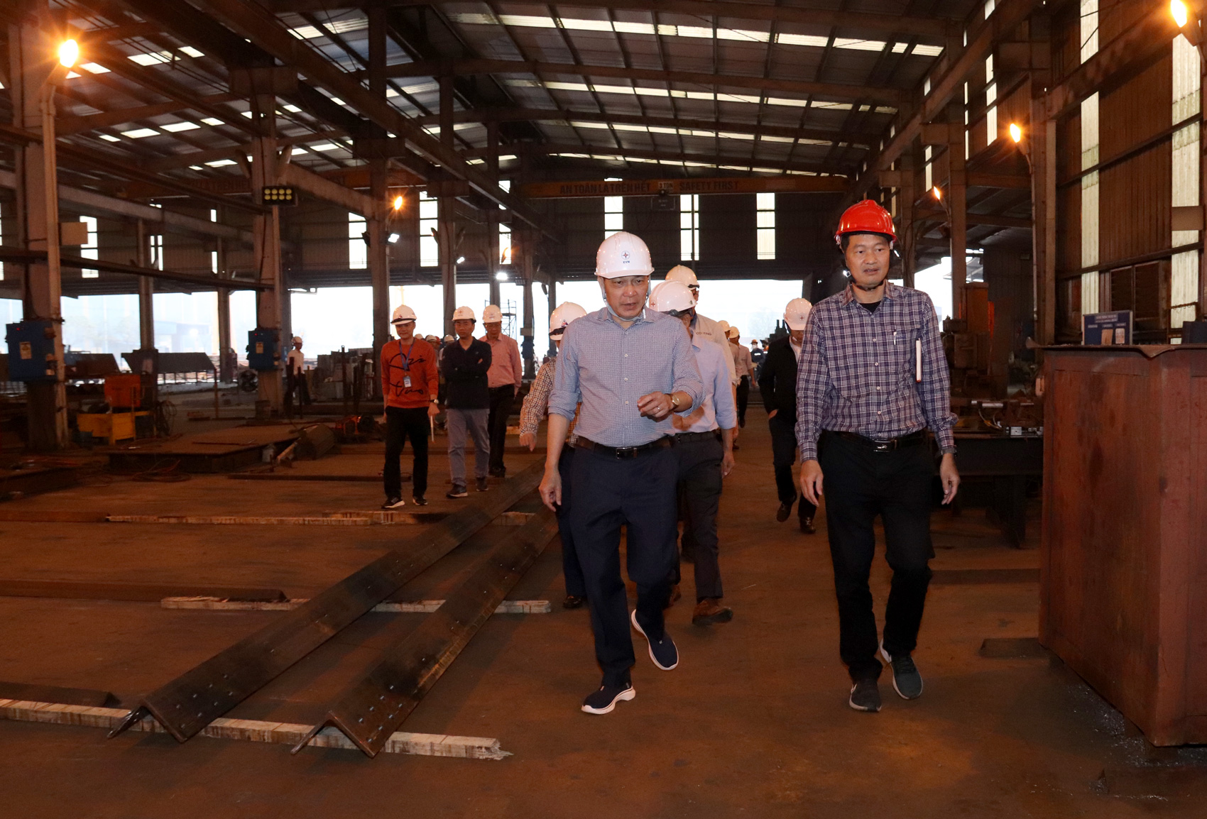 | Chủ tịch HĐTV EVN Đặng Hoàng An (ngoài cùng bên trái) cùng đoàn công tác kiểm tra công tác sản xuất cột thép tại Nhà máy sản xuất Việt Vương ở Hưng Yên |
