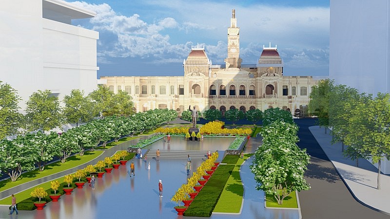 | Điểm nổi bật của Đường hoa Tết Quý Mão năm nay là sự thay đổi tiểu cảnh hoa tại khu vực tượng đài Bác Hồ phía trước tòa nhà UBND TP. Hồ Chí Minh |