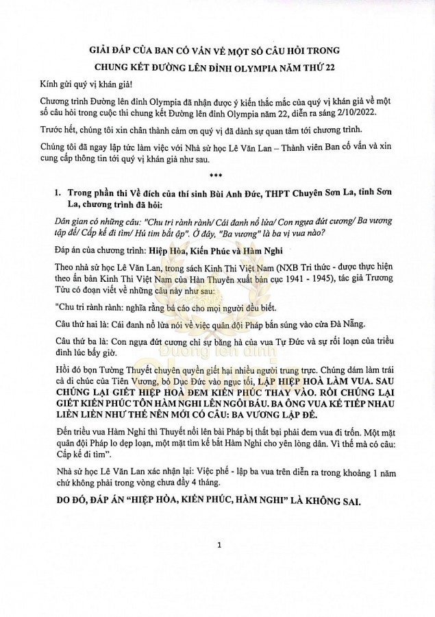 Trước tranh cãi về đáp án hai câu hỏi lịch sử, ngày 3/10, ban tổ chức chương trình Đường lên đỉnh Olympia đã có văn bản giải đáp chính thức đăng tải trên fanpage khẳng định đáp án "Hiệp Hòa, Kiến Phúc, Hàm Nghi" là không sai.