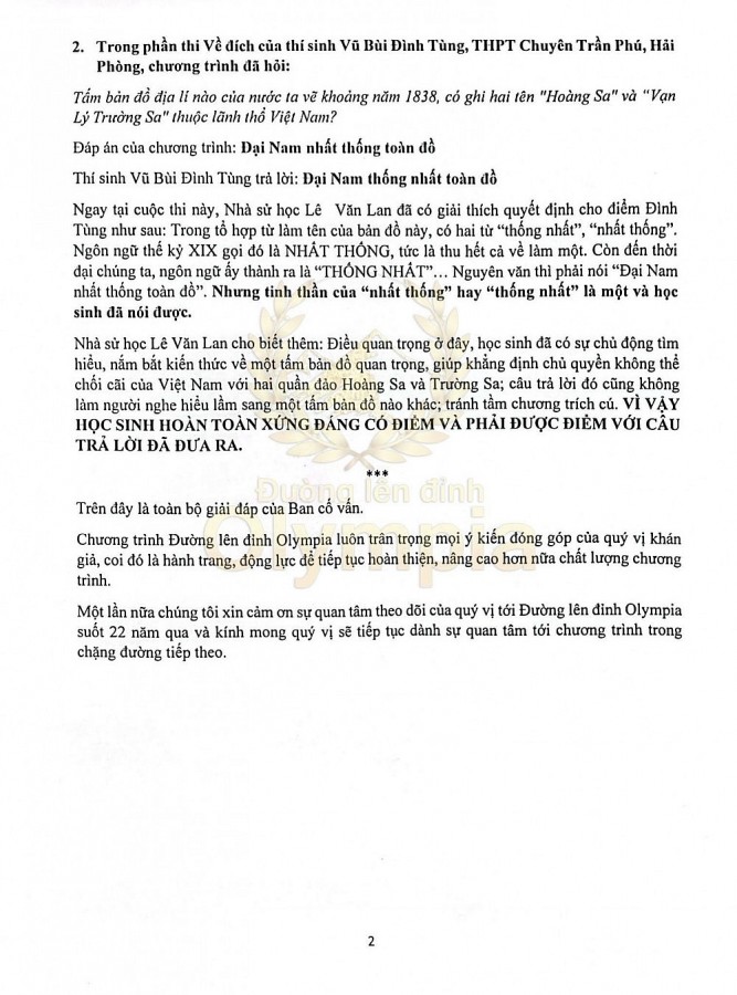 Đáp án câu hỏi lịch sử thứ 2 ở phần thi về đích của thí sinh Vũ Bùi Đình Tùng cũng tiếp tục gây tranh cãi sau trận chung kết. Ban tổ chức đưa ra câu hỏi: "Tấm bản đồ địa lý nào của nước ta vẽ khoảng năm 1838, ghi hai tên Hoàng Sa và Vạn Lý Trường Sa thuộc lãnh thổ Việt Nam?", thí sinh Đình Tùng trả lời đáp án "Đại Nam thống nhất toàn đồ". Đáp án của chương trình là "Đại Nam nhất thống toàn đồ".