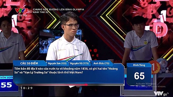 Còn đáp án cho câu hỏi "Tấm bản đồ địa lý nào của nước ra vẽ khoảng năm 1838, có ghi hai tên "Hoàng Sa" và "Vạn Lý Trường Sa" thuộc lãnh thổ Việt Nam? Trong thông báo tối 3/10 của chương trình, Nhà sử học Lê Văn Lan cho rằng điều quan trọng là học sinh đã chủ động tìm hiểu, nắm bắt kiến thức. Câu trả lời của Đình Tùng cũng không làm người nghe hiểu nhầm sang một tấm bản đồ khác, nên em "xứng đáng có điểm".