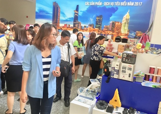 | Delegates and representatives from the business community look at products displayed at the Viet Nam Entrepreneurs Day event in HCM City - Photo: VNA |