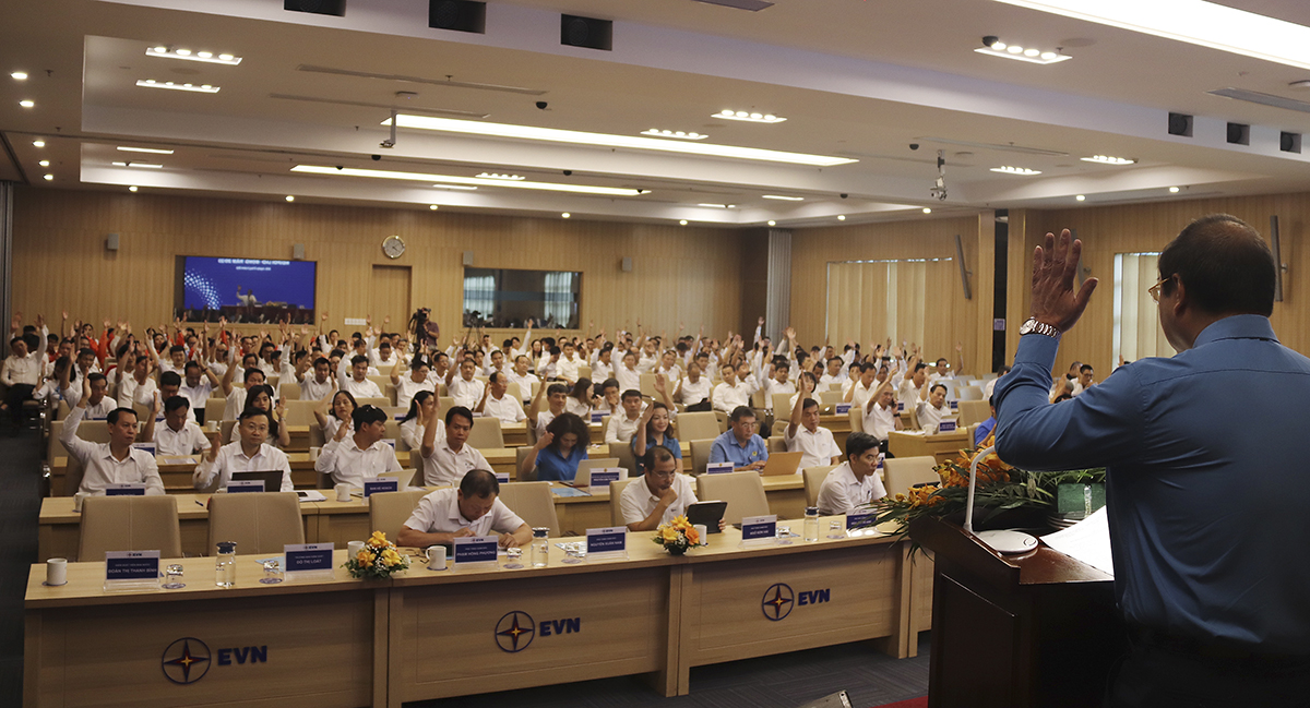 Các đại biểu biểu quyết thông qua Nghị quyết Hội nghị Người lao động EVN năm 2023. Ảnh: Minh Thành