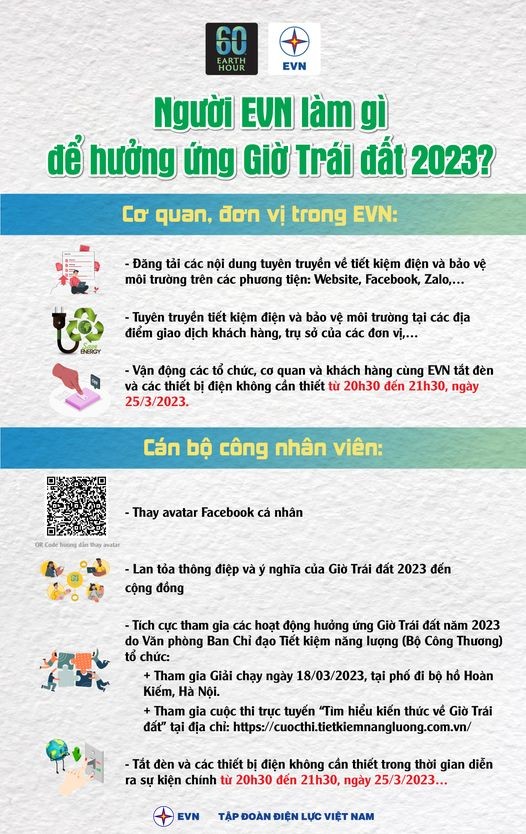 Năm 2023 đánh dấu năm thứ 15 Việt Nam tham gia hưởng ứng Chiến dịch Giờ Trái đất tại Việt Nam do Tổ chức Quốc tế về Bảo tồn thiên nhiên (WWF) tại Việt Nam, Bộ Công Thương đồng chủ trì đã thu hút sự quan tâm, hưởng ứng của 63 tỉnh thành phố cùng đông đảo các tầng lớp nhân dân, trong đó Tập đoàn Điện lực Việt Nam (EVN) là một trong những đơn vị điển hình luôn quan tâm và tích cực phối hợp để thực hiện tốt chương trình.