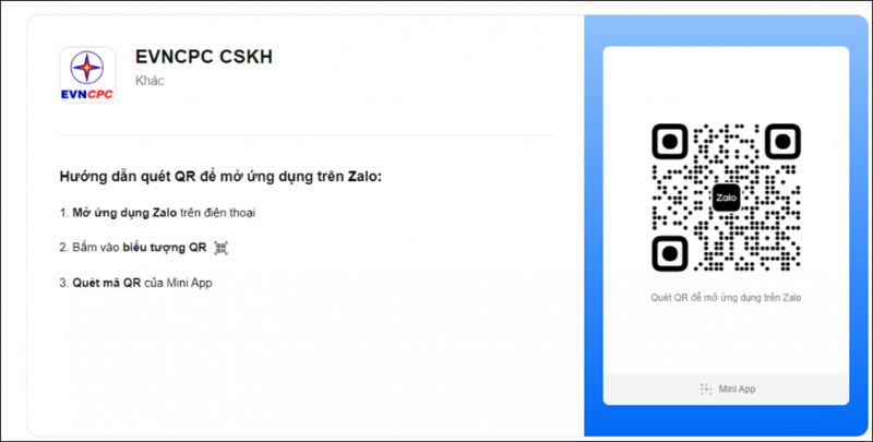Khách hàng sử dụng điện có thể truy cập Zalo mini app bằng cách quét QR trên camera của điện thoại hoặc QR Scanner của Zalo; ngoài ra, khi QR Code được gửi qua Zalo, người dùng có thể truy cập trực tiếp EVNCPC CSKH mini app tại tin nhắn mà không cần phải bật camera.