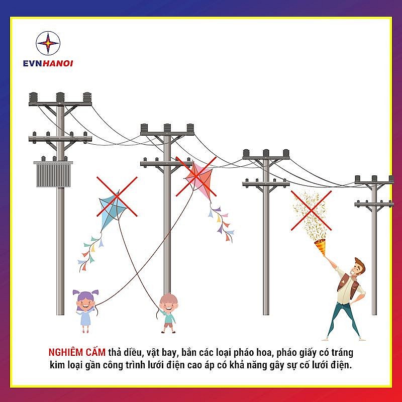 Cùng với đó, EVNHANOI cũng khuyến nghị nhân dân Thủ đô không bắn các loại pháo hoa, pháo giấy có tráng kim loại gần đường dây thiết bị lưới điện và trạm điện; Không thả đèn trời, thả diều, đồ chơi - thiết bị bay tại các khu vực có đường dây thiết bị lưới điện và trạm điện; Không lạm dụng cột điện, trạm điện làm hàng quán và các hình thức kinh doanh khác để tránh sự nguy hiểm nếu có sự cố …