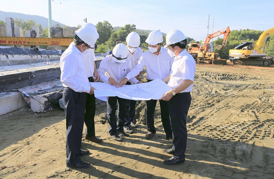 Ông Nguyễn Văn Hợp - Chủ tịch HĐTV EVNSPC và đoàn công tác kiểm tra thực tế tiến độ thi công tại công trình Trạm biến áp 110kV Long Sơn (tỉnh Bà Rịa-Vũng Tàu) |