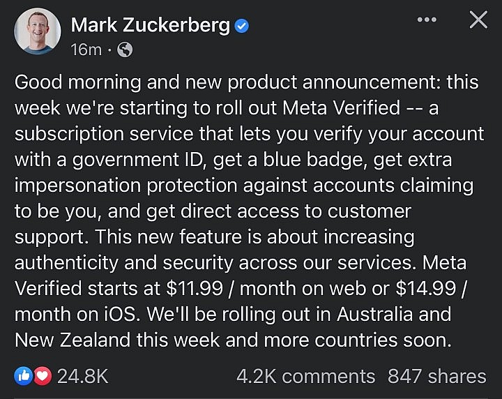 Cũng theo CEO của Meta, dịch vụ sẽ có giá 11,99 USD/tháng nếu thanh toán qua phiên bản web và 14,99 USD/tháng nếu thanh toán trên iOS. Dịch vụ sẽ được ra mắt trước tại Australia và New Zealand trước khi triển khai thêm tại nhiều quốc gia khác.
