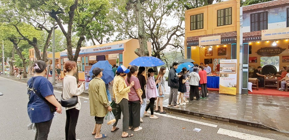 Du khách trải nghiệm văn hóa xếp hàng thời bao cấp tại Festival Thu Hà Nội năm 2024. Ảnh: Hoài Nam